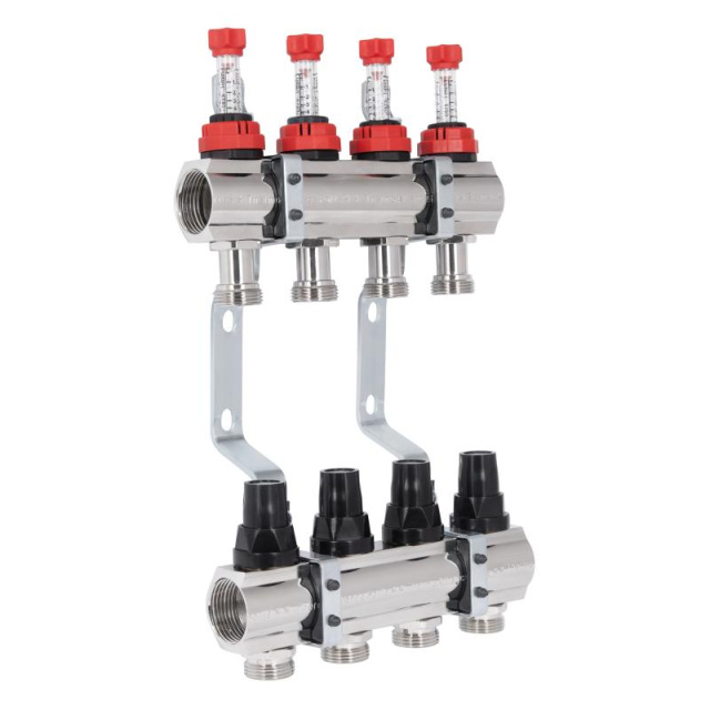 Колектор з витратомірами Thermo Alliance Forte 1" на 4 виходи складається з колекторних латунних балок (подаючої з витратомірами та зворотного ходу
