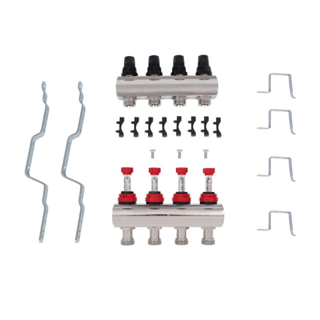 Колектор з витратомірами Thermo Alliance Forte 1" на 4 виходи складається з колекторних латунних балок (подаючої з витратомірами та зворотного ходу з термостатичними клапанами) і двох кронштейнів для кріплення до стіни або в шафі. На термоклапанах — ручки керування. Є можливість підключення сервоприводів 30х1,5 (вони не входять до комплекту). Пристрій забезпечує рівномірний розподіл теплоносія по контурах системи «тепла підлога».