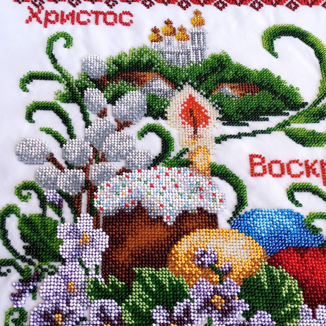 Це вишуканий виріб ручної роботи, що поєднує в собі глибокий символізм та майстерну вишивку бісером. Композиція з паскою та писанками символізує достаток, а компактний розмір ідеально підходить, щоб охайно накрити святковий кошик для освячення.
