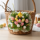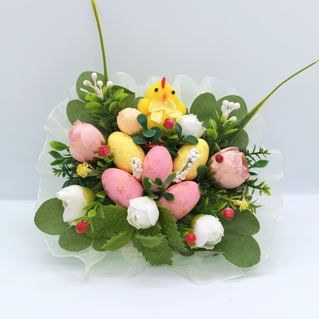 Великодня прикраса для кошика з декоративною композицією з кольорових яєць, квітів і зеленого листя. Центральним елементом є маленьке жовте курчатко, яке додає композиції святкового та весняного настрою. Такий декор гарно доповнює великодній кошик і робить його більш виразним.