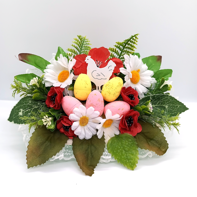 Великодня прикраса для кошика з декоративною композицією з квітів, зеленого листя та кольорових яєць. У центрі розміщена фігурка курочки, а навколо — писанки та квіти, що створюють яскравий і святковий вигляд. Такий декор гармонійно доповнює великодній кошик і підкреслює святкову атмосферу.